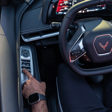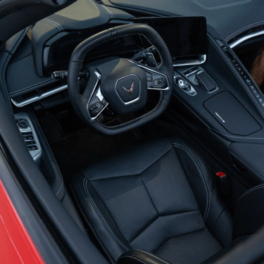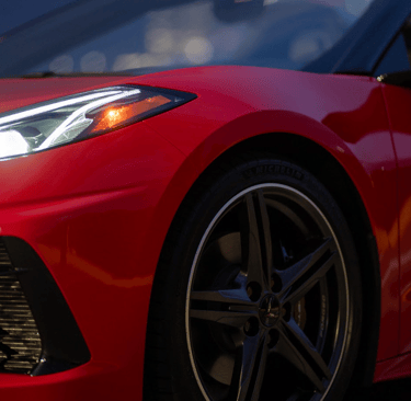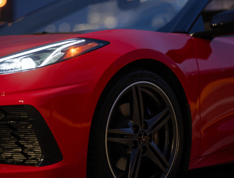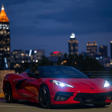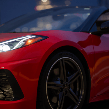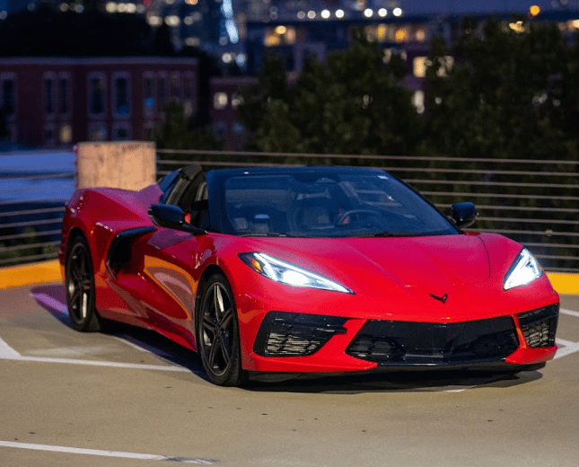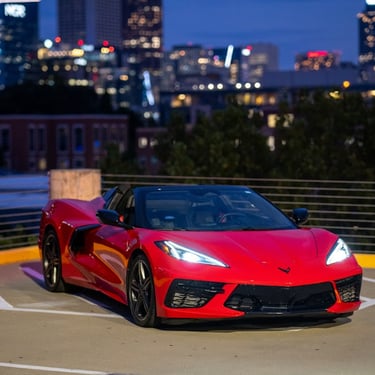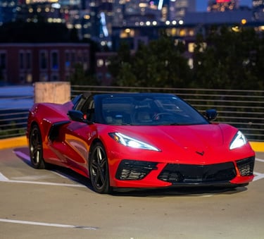 A striking red Chevrolet Corvette C8 that commands attention with its sharp aerodynamic design, aggressive front fascia, and low, mid-engine stance, a perfect fusion of American performance and exotic supercar appeal.