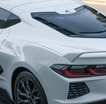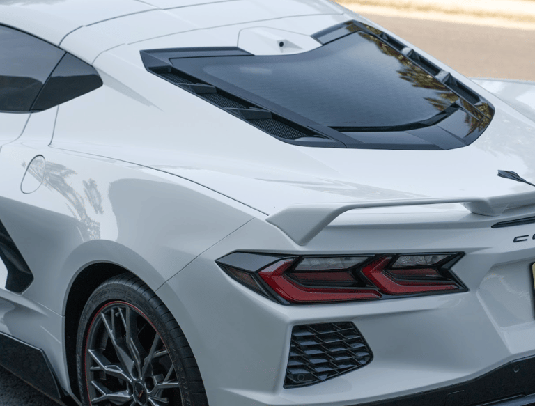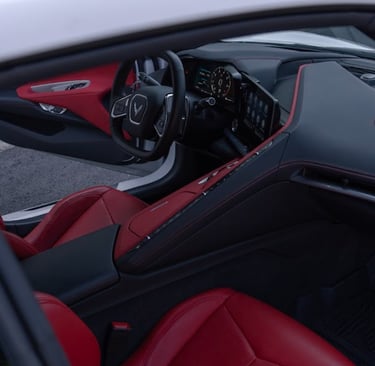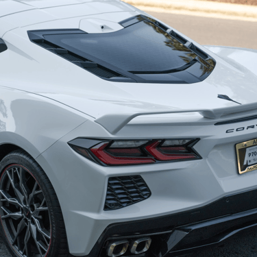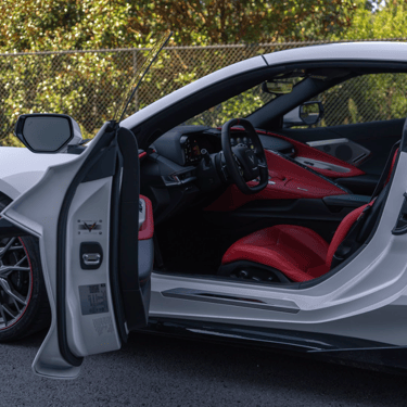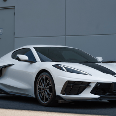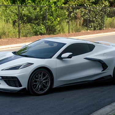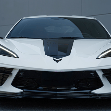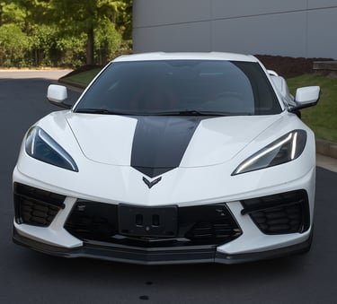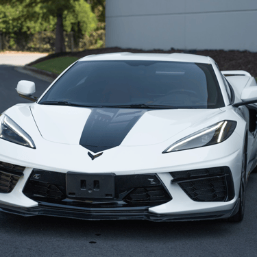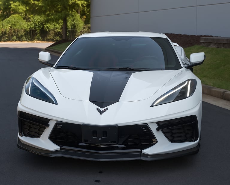 A white Chevrolet Corvette C8 with a bold black racing stripe, showcasing its mid-engine design, sharp aerodynamic lines, and aggressive stance that perfectly blends American muscle with exotic supercar styling.